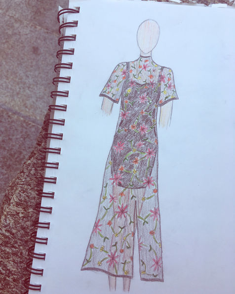 The designs I created for my Draping class. It features a stretch black bodysuit, mesh swing pants, and purple sewn-on flowers.